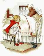 One morning Little Red Riding Hood's mother said, "Put on your things and go to see your grandmother. She has been ill; take along this basket for her. I have put in it eggs, butter and cake, and other dainties."