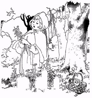 Little Red Riding Hood wandered from her path and was stooping to pick a flower when from behind her a gruff voice said, "Good morning, Little Red Riding Hood." Little Red Riding Hood turned around and saw a great big wolf, but Little Red Riding Hood did not know what a wicked beast the wolf was, so she was not afraid.