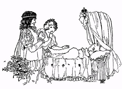 Once upon a time there was a king and queen who for a very long time had no children, and when at length a little daughter was born to them they were so pleased that they gave a christening feast to which they invited a number of fairies. But, unfortunately, they left out one rather cross old fairy, and she was so angry that she said the princess should die when she reached the age of sixteen, by pricking her hand with a spindle.