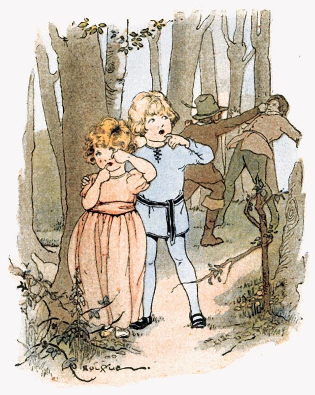 After going many miles into the woods one of the robbers said, "Let us not kill the little children, they never harmed us." The other robber would not consent, so they came to blows. This frightened the children so much that they ran away and did not see the robbers again.