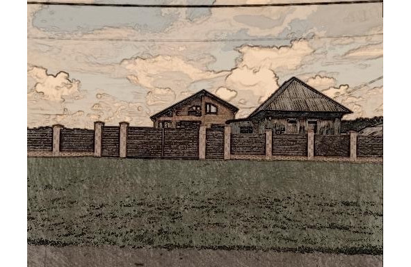 Наш дом обшит досками, покрытыми голубой краской. Поверх толстого слоя краски мама широкой кистью вывела красивые огромные бутоны жёлтых, красных, розовых цветов. Она так сильно любит цветы, что половина сада засеяна разными сортами роз, настурций, космеи.