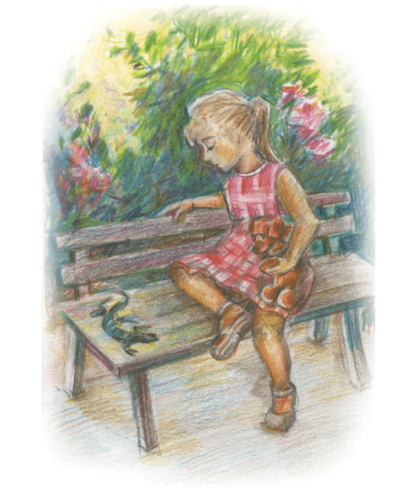 Вдруг Анечка заметила, что кто-то вцепился двумя маленькими лапками за край скамейки, приподнял свою продолговатую головку, а часть остального туловища висела. Девочка затаила дыхание и ждала. Незнакомец, наконец, взобрался и приник к тёплому солнечному пятнышку всем телом. «Это не червячок, — подумала Аня. — У червячков лапок нет. А у этого существа четыре лапки, длинное туловище, потом хвостик. И весь он серенький, полосочки на спине и по бокам.