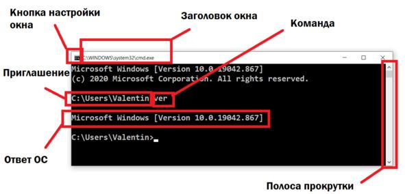Запускается командное окно. В правой части окна видна полоса прокрутки. На рисунке показаны основные элементы интерфейса.