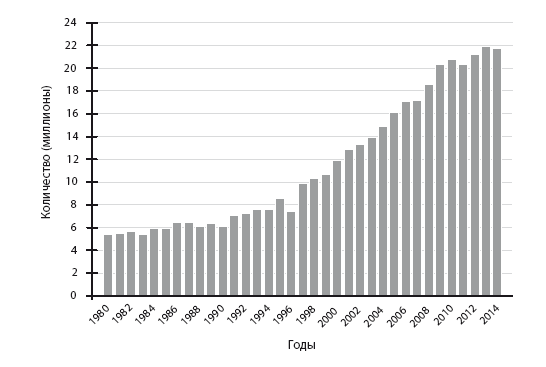 Как показано на рисунке 1.1, процент людей с ожирением мгновенно вырос. Десять лет спустя, как мы можем убедиться из рисунка 1.2, вслед за ним начал неминуемо расти диабет. В 1980 году в среднем около 108 миллионов человек жили с диагнозом «диабет». К 2014 году число диабетиков достигло 422 миллионов (14). Больше всего опасений внушает тот факт, что число заболевших неуклонно продолжает расти.