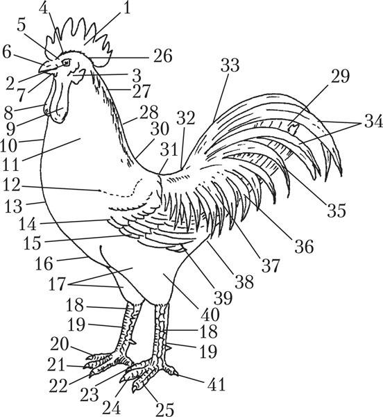 18 – пятка; 19 – плюсна; 20 – наружный палец; 21 – средний палец; 22 и 23 – внутренний палец; 24 – средний палец; 25 – наружный палец; 26 – затылок; 27 – верхняя часть шеи; 28 – средняя часть шеи; 29 – рулевые перья; 30 – нижняя часть шеи; 31 – верхняя часть спины; 32 – средняя часть спины; 33 – поясница; 34 – большие косицы хвоста; 35 – малые косицы и кроющие перья хвоста; 36 – поясничные перья; 37 – малые кроющие перья хвоста; 38 – маховые перья второго порядка; 39 – маховые перья первого порядка; 40 – хлуп и кочень; 41 – задний палец