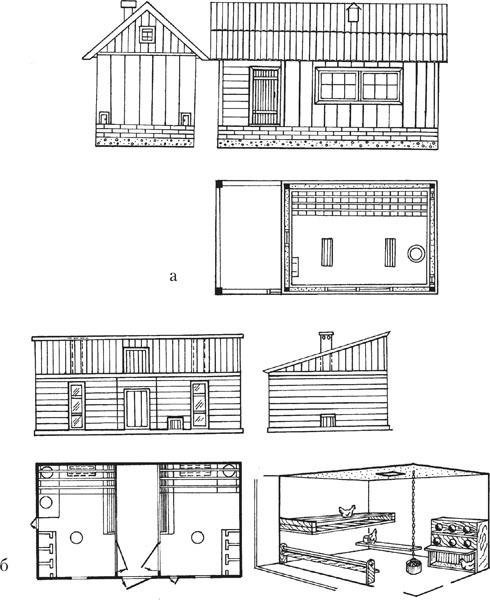 Птичники разных типов: а – зимний птичник; б – летний птичник