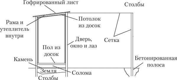 При отсутствии каких-либо других построек, кроме птичника, в нем следует предусмотреть помещение для хранения кормов и инвентаря.