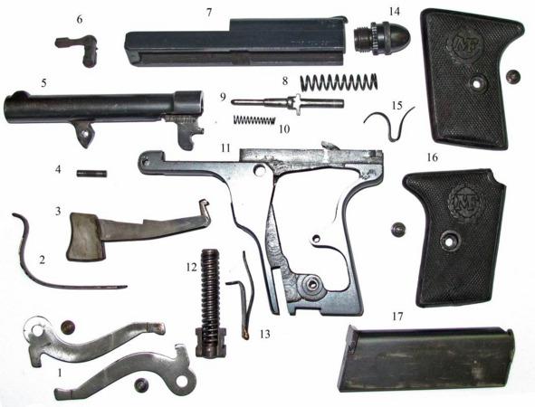 При повороте вниз защелки ствол под действием пружинящей спусковой скобы откидывается вверх под углом примерно 30° для размещения патрона (первый патрон необходимо вручную вставить в патронник, далее перезаряжание происходит автоматически). После чего установить ствол на место. При нажатии на хвост спускового крючка сжимается боевая пружина и взводится ударник. При достижении спусковым крючком крайнего заднего положения происходит срыв ударника с боевого взвода, в результате чего он устремляется вперед. При извлечении магазина ствол автоматически откидывается вверх под углом примерно 30°, запирающий рычаг ствола поворачивается вниз и останется в данном положении до тех пор, пока не будет вновь вставлен магазин. При отсутствии магазина запирание ствола не происходит.