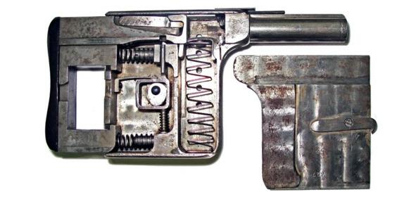 При повороте вниз защелки ствол под действием пружинящей спусковой скобы откидывается вверх под углом примерно 30° для размещения патрона (первый патрон необходимо вручную вставить в патронник, далее перезаряжание происходит автоматически). После чего установить ствол на место. При нажатии на хвост спускового крючка сжимается боевая пружина и взводится ударник. При достижении спусковым крючком крайнего заднего положения происходит срыв ударника с боевого взвода, в результате чего он устремляется вперед. При извлечении магазина ствол автоматически откидывается вверх под углом примерно 30°, защелка ствола поворачивается вниз и останется в данном положении до тех пор, пока не будет вновь вставлен магазин. При отсутствии магазина запирание ствола не происходит.