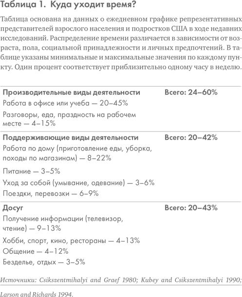 Как же, в таком случае, люди тратят время? Из таблицы 1 вы узнаете, как мы обычно проводим те шестнадцать часов в день, когда находимся в сознании и бодрствуем. Приведенные в ней цифры, разумеется, весьма приблизительны, поскольку в зависимости от того, идет ли речь о человеке молодом или пожилом, бедном или богатом, мужчине или женщине, они будут весьма различаться. Тем не менее из таблицы можно почерпнуть общее представление о том, как строится день в нашем обществе. При этом большинство приведенных показателей подобны данным, полученным в других развитых странах.