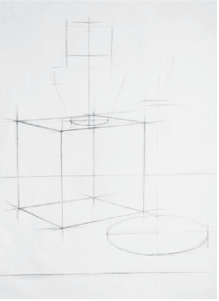Для выявления конструкции предмета при построении рисуем предметы насквозь «прозрачными». При этом появляется возможность прочувствовать пространственность формы. Определить соотношения сторон предметов. Построение выполняем легкими линиями, тогда при дальнейшей отрисовке их можно не стирать, они вольются в общий силуэт формы, намечаем условную линию горизонта, которая поможет верно определить перспективные сокращения.