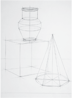 Линии, ограничивающие плоскости предметов, рисовать надо шире, не прерывать на месте пересечения у опорных точек, а наметить в сторону точек схода. Для нахождения положения ближайшей точки или угла гипсового предмета можно подвести к нему касательную горизонтальную линию. Это поможет выявить степень перспективных сокращений боковых сторон тела. Акцентированной линией выявляем первый план, а мягкими линиями — уходящие в глубину ребра.