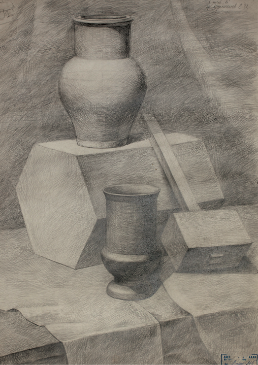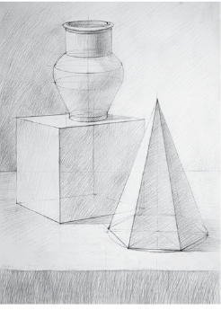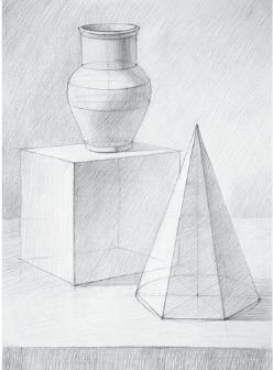 Проанализировав распределение светотени на форме, можно понять различия в светотональных градациях. Передний план постановки прорисовываем тщательнее, чем последующие. Для выявления объема линейное изображение проштриховывается.