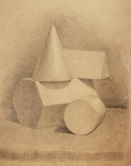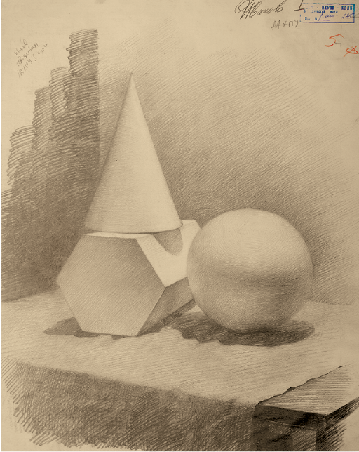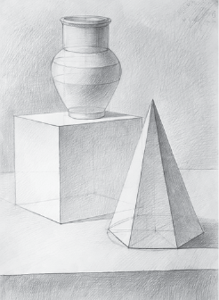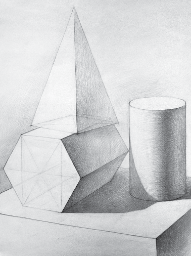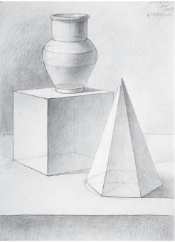Делаем обобщение рисунка, соподчиняем его основному замыслу. Уточняем правильность выполнения рисунка в светотеневой градации на разноудаленных плоскостях постановки. Работа ведется над художественной выразительностью рисунка группы геометрических тел. Рисуем не отдельно стоящий предмет, а целую группу в пространстве с моделированием объема дифференцированной светотенью. Работа над постановкой вырабатывает координирующие навыки работы глаза, мозга, руки.