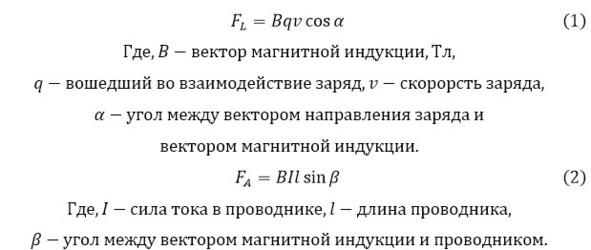 Во время действия электромагнита начинает действовать при рассмотрении заряда, сила Лоренца (1) и сила Ампера (2), полученные эмпирически.