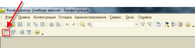 Сейчас у нас открыт конфигуратор (на рис. 1-10 мы нажали на кнопку Конфигуратор). Чтобы увидеть дерево объектов конфигурации, нужно нажать на кнопку Открыть конфигурацию.