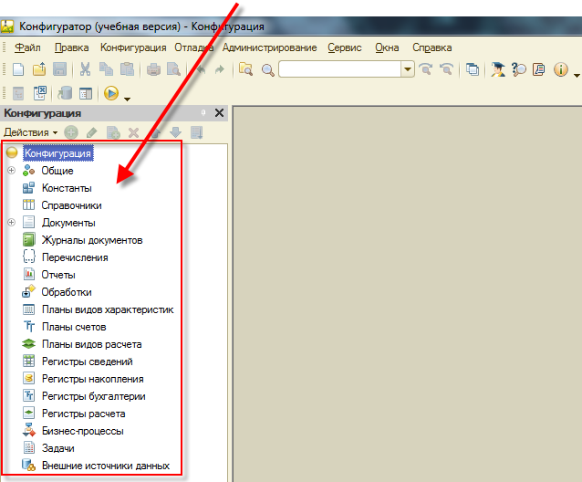 Сейчас это дерево «пустое», оно содержит только ветки верхнего уровня объектов метаданных, которые есть в любой информационной базе 1С:Предприятия.