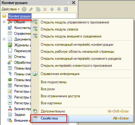 Выбираем свойства конфигурации – отмечаем самый верхний уровень дерева конфигурации и из меню по правой кнопке мыши выбираем Свойства. А можно просто нажать Alt+Enter.