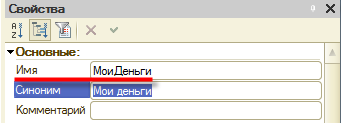 В отрывшейся палитре свойств пишем Имя – МоиДеньги. После нажатия Tab или Enter на клавиатуре, синоним заполнится автоматически.
