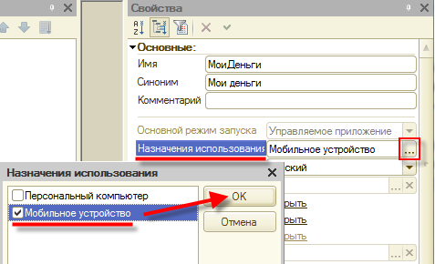 Кроме этого, сразу укажем платформе 1С:Предприятия, что разработка будет вестись для мобильной платформы. Свойство Назначения использования устанавливаем в Мобильное устройство.