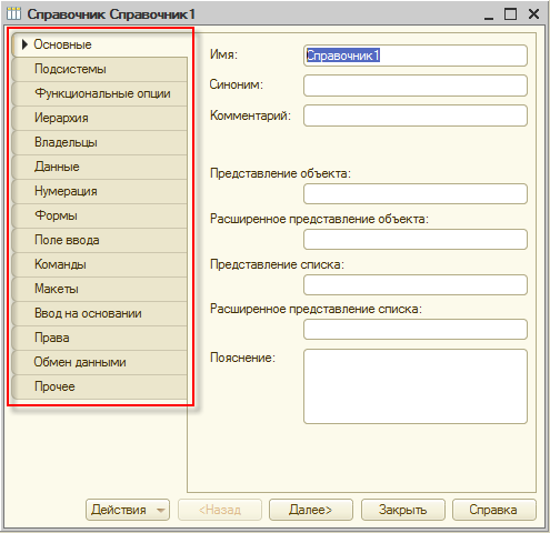Хотя все те же свойства справочника можно задать и в палитре свойств справа, удобнее пользоваться этим диалогом. Последовательно переходя по закладкам этого диалога, можно заполнить все нужные свойства и ничего не пропустить.
