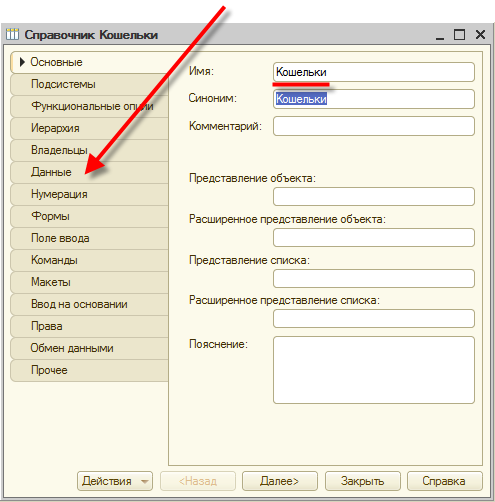 Начнем с имени – Кошельки. Синоним система 1С:Предприятие добавит сама, после того, как мы нажмем клавишу Enter или Tab в поле Имя. Больше здесь ничего заполнять не нужно – перейдем на закладку Данные.