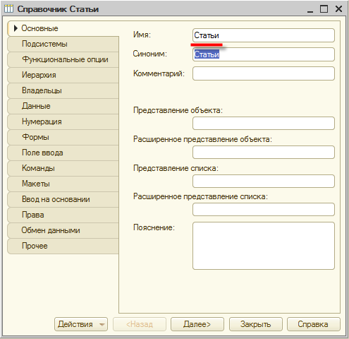 Аналогично предыдущему справочнику заполним у него имя – Статьи.