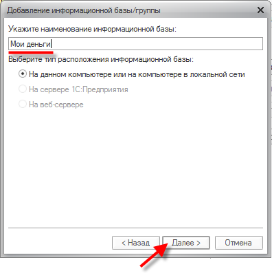 Теперь система поинтересуется, как будет называться наша новая информационная база. Название можно дать любое, оно ни на что не влияет, но лучше назвать ее Мои деньги. Именно это название будет отображаться в списке информационных баз, который открывается при запуске системы. Нажмем Далее >.