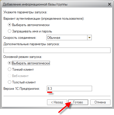 В следующем окне ничего менять не будем. Главное проконтролировать, что поле «Версия 1С:Предприятия» содержит значение «8.3». Жмем сразу Готово.