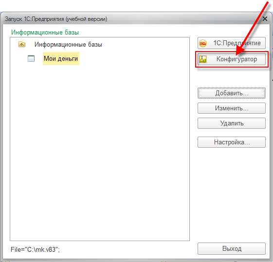 В результате в списке информационных баз мы увидим нашу новую базу – Мои деньги. Останется лишь нажать на кнопку Конфигуратор, чтобы начать создание нашей «программы».