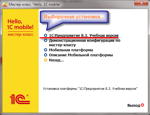 Сделать это просто. Вставим диск МАСТЕР-КЛАСС в дисковод, в открывшемся окне перейдем в раздел ⇒Выборочная установка… и выберем пункт ⇒1С:Предприятие 8.3. Учебная версия. Если окно автозапуска не сработало, запустите вручную с диска программу «autorun.exe».