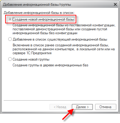 Стандартно предлагается создать новую информационную базу – именно это нам и нужно. Поэтому снова согласимся и нажмем Далее >.