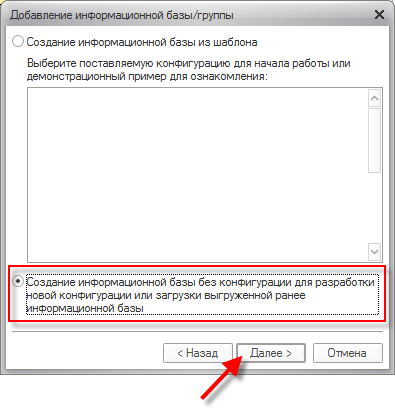 Но мы с вами не устанавливали никаких шаблонов, поэтому снова согласимся с тем, что стандартно предлагает нам система – создать информационную базу без конфигурации (то есть без «программы») и просто нажмем Далее >.