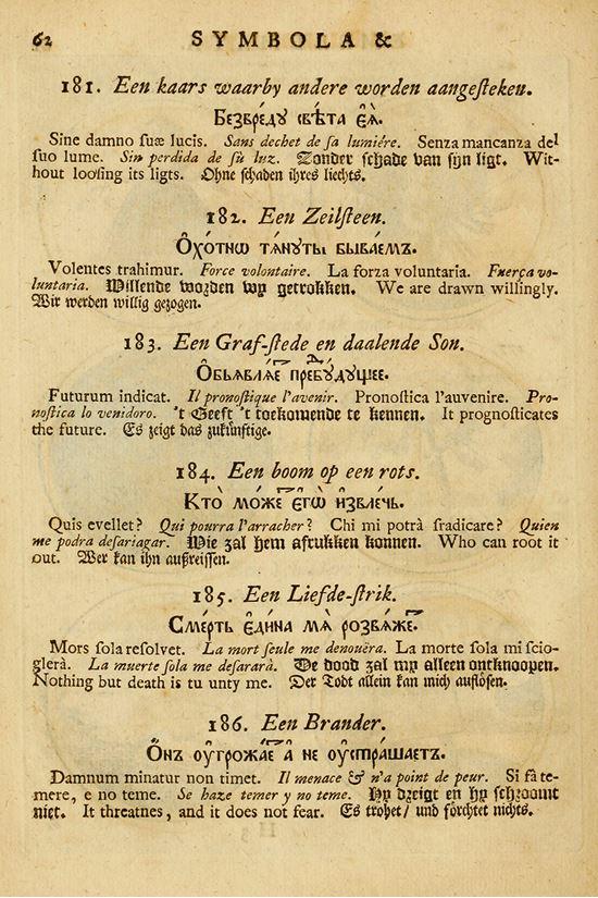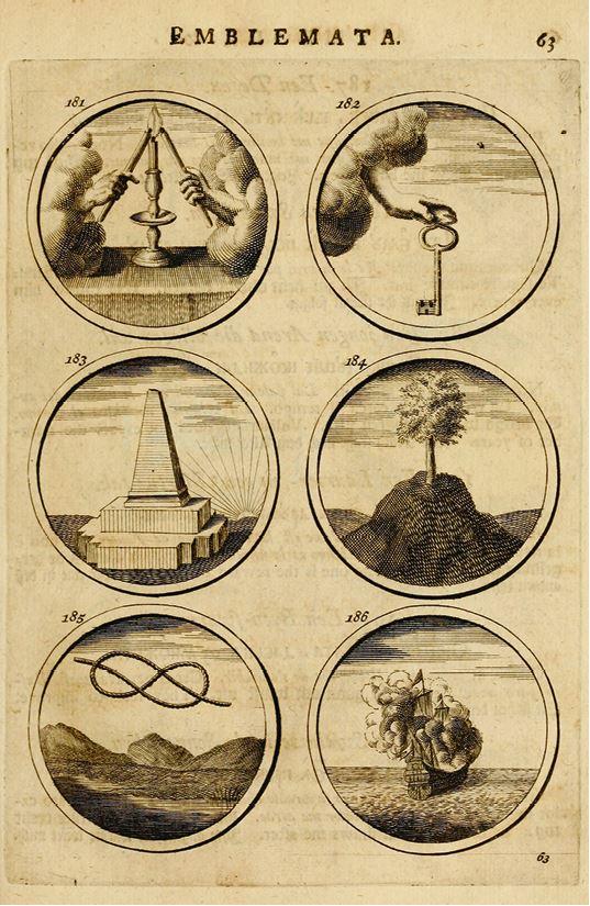 Имена кораблей Петр брал из книги «Символы и эмблематы», которую по его заданию скомпилировали и перевели в Амстердаме (1705). Основой послужили две иллюстрированные книги французского гравера и писателя Даниэля де ла Фёй (Daniel de La Feuille). Разворот книги «Символы и эмблематы». Амстердам, типография Генриха Ветстейна, 1705