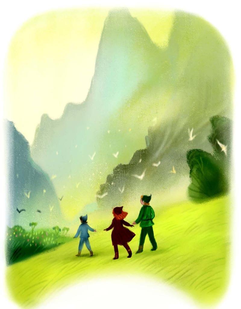 Так, напевая, мы шагали всё дальше и дальше. Далеко-далеко позади осталась наша родная деревушка Тихий Ули. Путь пролегал мимо многих деревень, через Дикие леса, к Пяти горам.