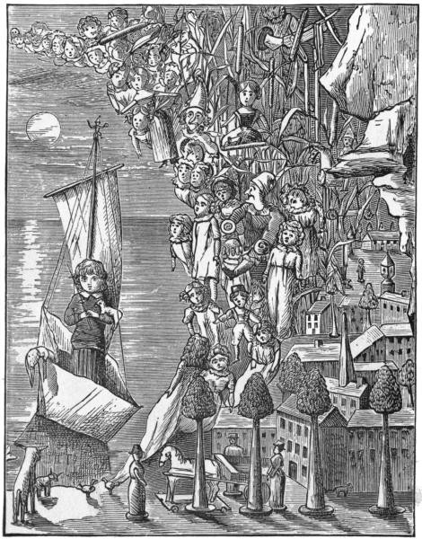 He saw land at last far on a-head, and as he drew near it he understood whither the boat was bound. All along the shore there were hundreds and hundreds of dolls crowding down to the water's edge, looking as if they had expected him. They stared at him with their shining round eyes; but he just clasped his little goat tighter and closer, and sailed on nearer and nearer to the land. The dolls did not move; they stood still, smiling at him with their painted lips, then suddenly they opened their painted mouths and put out their painted tongues at him; but still he was not afraid. He clasped the goat yet a little closer, and called out, "Apple-blossom, I am waiting; are you here?" Just as he had expected, he heard Apple-blossom's voice answering from the back of the toy-town—