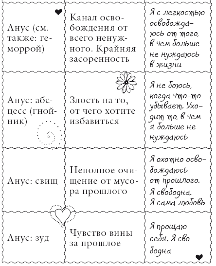Приведенный ниже перечень ментальных эквивалентов был составлен в результате многолетних исследований на основе моего собственного опыта работы с пациентами, по моим лекциям и семинарам. Данный перечень можно рассматривать в качестве экспресс-руководства по выбору необходимого стереотипа мышления. Я предлагаю его с любовью, желая поделиться столь простым методом, дабы помочь вам Исцелить Свое Тело.