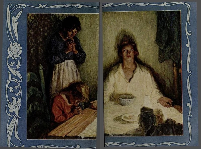 On the bench beside him was his hat containing the money which he had collected from the congregation at the close of the service. On either side were the doctor and the sheriff. The latter’s big hump now prominent as he leaned over the table. The minister led the discussion, and they remained for some time thus, in conference. The minister’s defective eye batting, the doctor’s crooked arm on the table, and the sheriff’s back throwing its humped shadow against the wall.