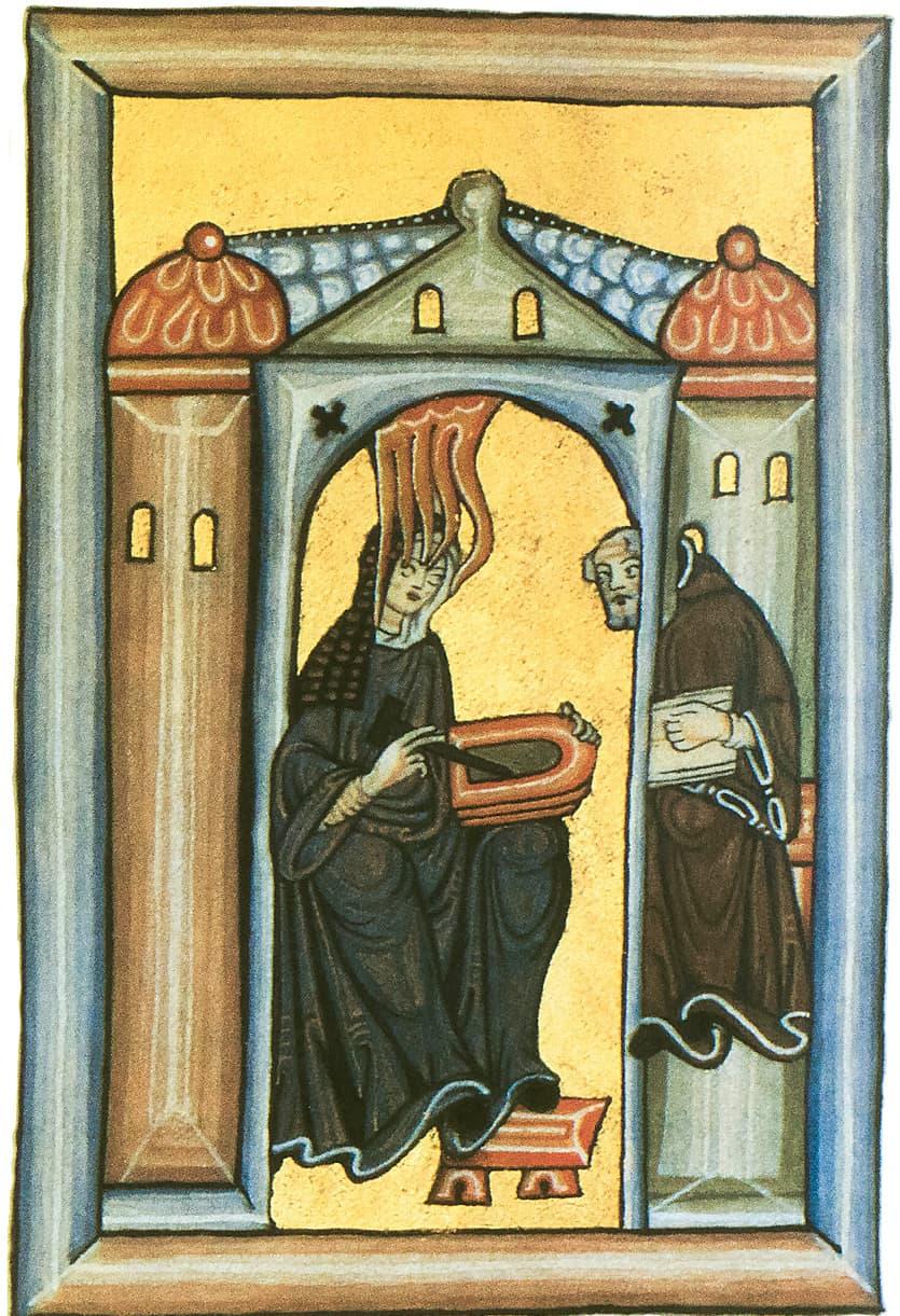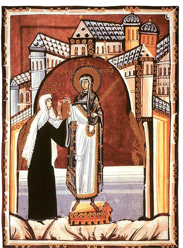 Наследие оттоновских скрипториев весьма обширно, и большинство средневековых женщин-просветительниц активно участвовало в этом культурном ренессансе. Среди них — Димут из монастыря Вессобрунн в Баварии. В тексте XVI века перечислены сорок пять книг, переписанных ее рукой, которые отличаются затейливо украшенными буквицами. Другая монахиня, по имени Гуда, сообщает, что она переписала и проиллюстрировала «Проповедь святого Варфоломея». Вклад этих женщин в историю иллюминированной книги хорошо задокументирован. Он охватывает множество книг, начиная с богато иллюстрированного астрономического трактата из Эльзаса с миниатюрой-посвящением, на которой изображена Дева Мария в окружении переписчицы Гуты и иллюстратора Синтрама, а также настоятельница Хитда, предлагающая свое Евангелие покровительнице монастыря святой Вальбурге (ок. 1020), и заканчивая очаровательным автопортретом некой Кларисии, изобразившей себя самозабвенно раскачивающейся на хвосте буквы Q в псалтири из Аугсбурга (ок. 1200). Кларисия — лишь одна из иллюстраторов этой псалтири; по мнению Дороти Майнер, она, скорее всего, была мирянка, обучавшаяся в скриптории монастыря, на это указывает ее наряд: непокрытая голова, заплетенные в косу волосы и облегающая туника под платьем с удлиненной талией и длинными свисающими концами рукавов с разрезом.
