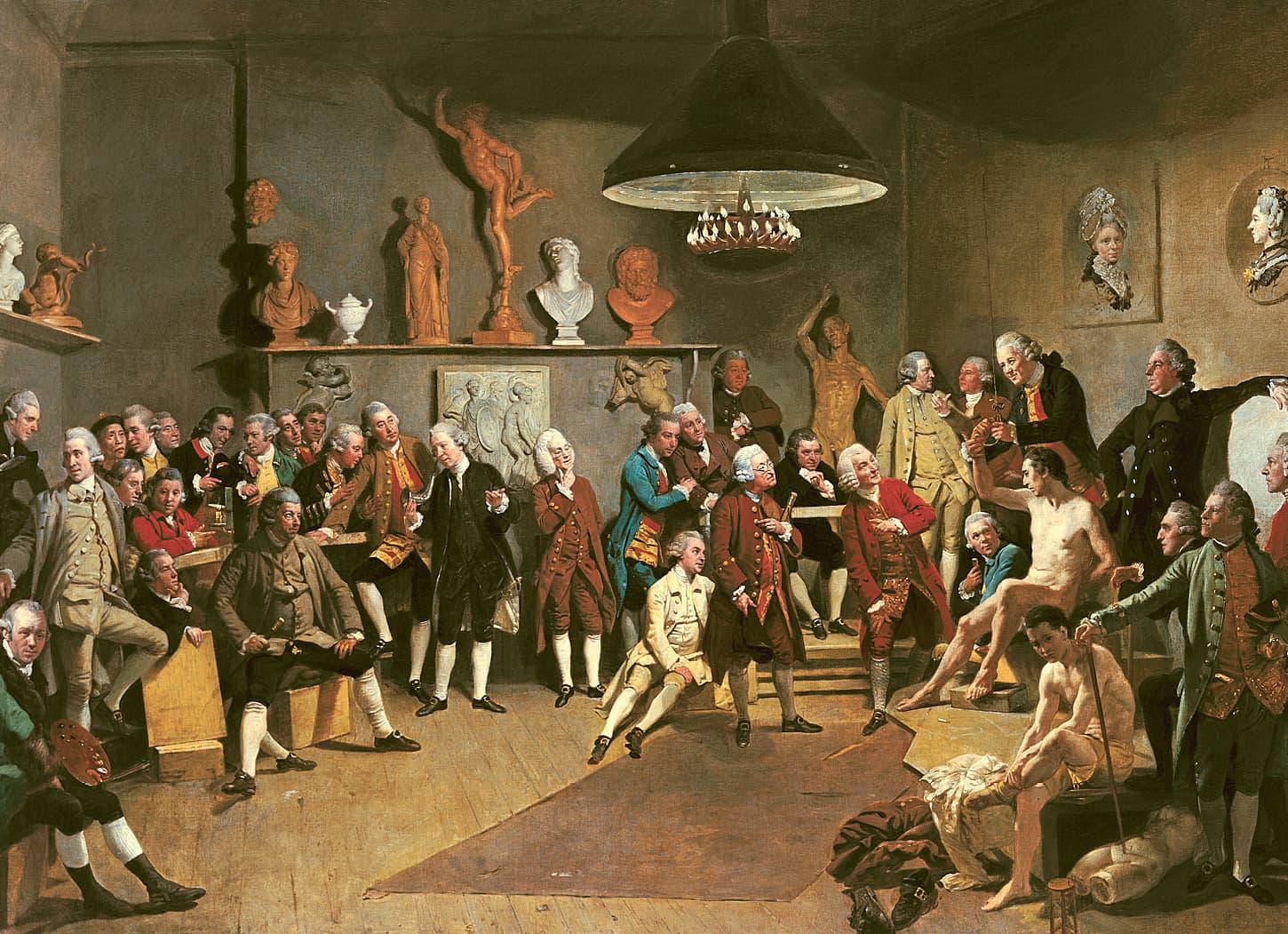 В числе основателей Британской королевской академии художеств в 1768 году были две женщины: художницы Ангелика Кауфман и Мэри Мозер. Обе — дочери иностранцев, обе активно подвизались в группе художников-мужчин, сыгравших ключевую роль в создании Королевской академии, что, несомненно, способствовало их членству. Кауфман, избранную в 1765 году в престижную Академию Святого Луки в Риме, по прибытии в Лондон в 1766 году провозгласили преемницей Ван Дейка. Она была самой известной художницей, связанной с декоративным и романтическим направлением классицизма, и в значительной степени способствовала распространению в Англии эстетических принципов аббата Винкельмана, ее, наряду с шотландцем Гэвином Гамильтоном и американцем Бенджамином Уэстом, считают популяризатором неоклассицизма. Мэри Мозер, чья репутация тогда соперничала с репутацией Кауфман, была дочерью Георга Мозера, швейцарского эмальера, первого хранителя Королевской академии. Модная художница, которой покровительствовала королева Шарлотта, она была одной из двух художников-флористов, принятых в Академию. Однако на групповом портрете кисти Иоганна Цоффани «Академики Королевской академии» (1772), посвященном недавнему основанию Королевской академии, Кауфман и Мозер нет среди художников, произвольно расположившихся вокруг голых натурщиков-мужчин. В беседе об искусстве, которую ведут мужчины, двум женщинам-академикам не нашлось места. Женщинам запрещалось изучать обнаженную натуру, что было основой академического обучения и изображения с XVI по XIX век. После Кауфман и Мозер ни одна женщина не допускалась в Британскую королевскую академию, пока в 1922 году Энни Луиза Суиннертон не стала ее ассоциированным членом, а в 1936 году Лору Найт не избрали полноправным членом.