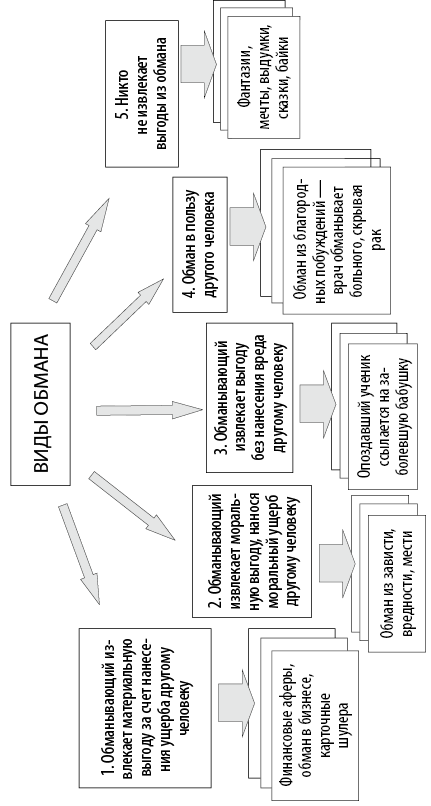 Классификации обмана будут сильно различаться в зависимости от подхода, то есть от того, с какой стороны рассматривать сам обман. Если мы выберем коммуникативный подход, то есть подойдем к обману как к передаче ложной информации, то сможем выделить чистую ложь, полуправду, ложь по умолчанию и т.д. Если взглянем на этот вопрос со стороны морали, то выделим обман злонамеренный и добродетельный. Например, если человек, исходя из зависти или других недобрых чувств, сообщает своему знакомому ложную информацию об измене его жены, то это будет злонамеренный обман. А если он, зная о реальной измене и стараясь оградить приятеля от излишних волнений, уверяет, что его супруга честна и невинна, то тем самым он прибегает к добродетельному обману. Правда, некоторые люди полагают, что обманывать всегда плохо, но это вопрос сложный и дискуссионный.