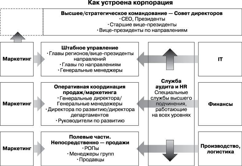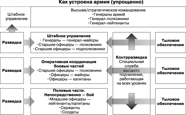 Всё управление в бизнесе, как и в армии, иерархично. Всю сегодняшнюю специфику плоских и вертикальных иерархий я разберу в одной из глав книги, а пока просто смотрим на параллели армий и больших корпораций.