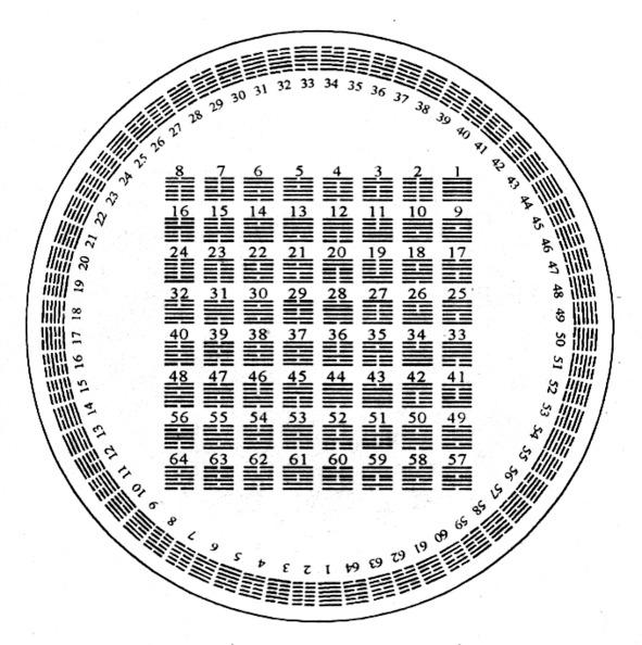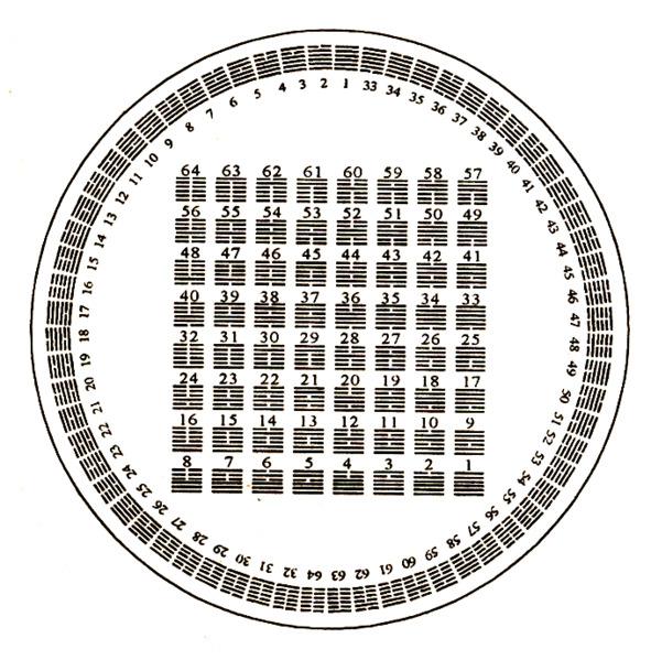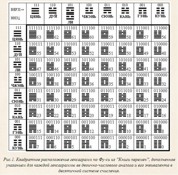 Постепенная смена целых (ян) и прерванных (инь) черт триграмм и гексаграмм в последовательности Фу-си подчинена той же закономерности, что и смена знаков 1 и 0 в обозначении натурального ряда чисел в двоичной арифметике. Соответственно 8 триграмм и 64 гексаграммы в последовательности Фу-си представляются в двоичном коде как 7 0 и 63 0 (см. схемы 5, 10). Создатель двоичной арифметики Лейбниц усмотрел в этом подобии, стимулировавшем его работу в данном направлении, свидетельство предустановленной гармонии и единства божьего промысла для всех времен и народов.