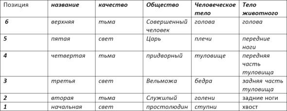 Предварительно опишем динамику процесса, отраженную в символизме позиций. Первая (нижняя) позиция знаменует начало, зарождение процесса; вторая — апогей его внутреннего развития; третья — кризисный переход от внутреннего состояния к внешнему; четвертая — внешнее обнаружение процесса; пятая его максимальное проявление; шестая — завершение или перерождение в иной процесс. Итак: