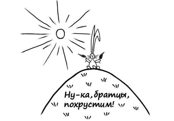 Вдруг заяц в ужасе обернулся вокруг себя юлой. С чего ему начать трапезу? Заяц снова крутанулся и снова, и снова. Наконец он замер и в растерянности плюхнулся посреди полянки.