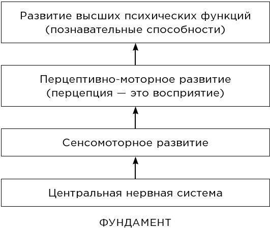 Как видите, мы ни разу не упомянули о буквах, цифрах, чтении, счете или математических задачах. А все потому, что у раннего возраста совершенно другие потребности. И главное, что нужно понимать: если потребности возраста не будут удовлетворены, а мы будем перескакивать на формирование других навыков, пропуская действительно важное, то на самом «верхнем этаже развития» (именно там, где начнется так называемое академическое обучение) возникнут сложности. Схема 1 отражает как раз то, насколько обучение ребенка в школе зависит от нижних уровней пирамиды (особенно от нашего фундамента, центральной нервной системы). Если мы не обеспечим благополучное развитие ребенка на нижних уровнях, то, вполне вероятно, столкнемся с тем, что у него возникнут сложности на верхних (которые начнут проявляться ближе к школе, в период того самого академического обучения).