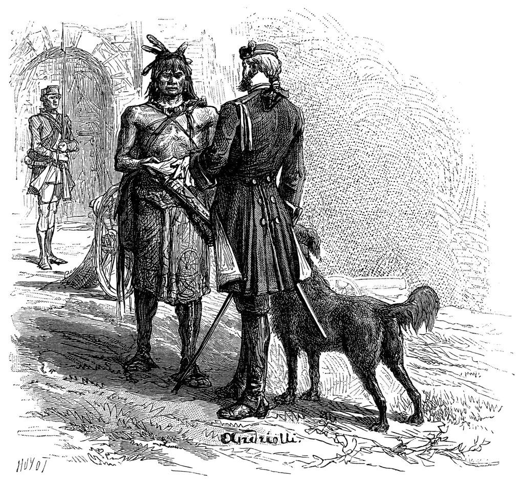 — Этот индеец — скороход при нашем отряде и, по понятиям своего племени, герой, — сказал молодой офицер. — Он вызвался проводить нас до озера по малоизвестной тропинке, которая сильно сокращает путь. Благодаря этому мы явимся на место скорее, чем следуя за нашим отрядом.