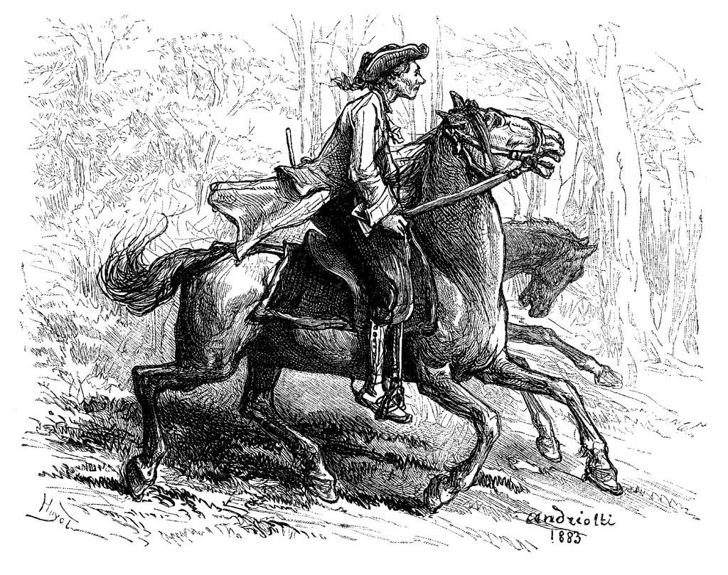 Через несколько мгновений они увидели жеребенка, который, точно олень, несся между стволами сосен; вслед за тем появилась нескладная фигура, описанная нами в предыдущей главе. Неуклюжий незнакомец приближался со всей скоростью, на которую была способна его тощая лошадь. До настоящего мгновения эта фигура выпала из поля зрения путешественников. Если он обычно привлекал любопытных своим высоким ростом, то его грация как наездника заслуживала еще большего внимания.