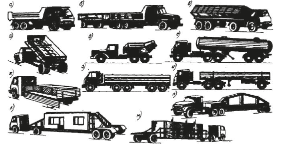 Рис. 2.2.1. Автотранспортные средства для доставки строительных грузов: а – автосамосвал; б – автопоезд с самосвальными прицепами; в – автомобиль с увеличенной вместимостью кузова; г – авторастворовоз; д – автобетоновоз; е – битумовоз; ж – бортовой автомобиль для доставки кирпича; з – плитовоз; и – балковоз; к – панелевоз; л – фермовоз; м – сантехкабиновоз