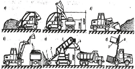 Рис. 2.3.1. Погрузчики: а – одноковшовый с задней разгрузкой (в момент загрузки и выгрузки); б – одноковшовый фронтальный с опрокидным ковшом; в – то же с челюстным ковшом; г – многоковшовый; д – автопогрузчик с вилочным подхватом; 1 – питательшнек; 2 – ковшовый элеватор; 3 – рама; 4 – загрузочный лоток; 5 – вилочный подхват; 6 – телескопический подъемник